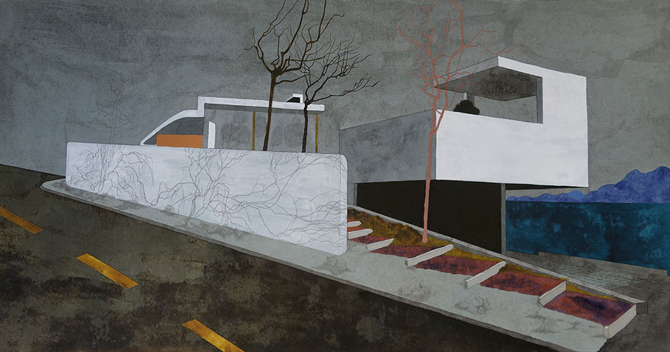 SUSPENSE, 2015 80 X 40 CM pencil, acrylic ink, acrylic paint, Indian ink, collage on cardboard