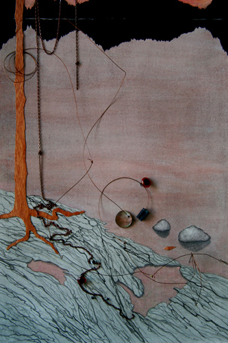 FROZEN WARNINGS 2012 27 X 40,3 CM pencil, acrylic ink, Indian ink on cardboard, wood veneer, metallic chain, glass, thread, shell, tourmaline, copper wire